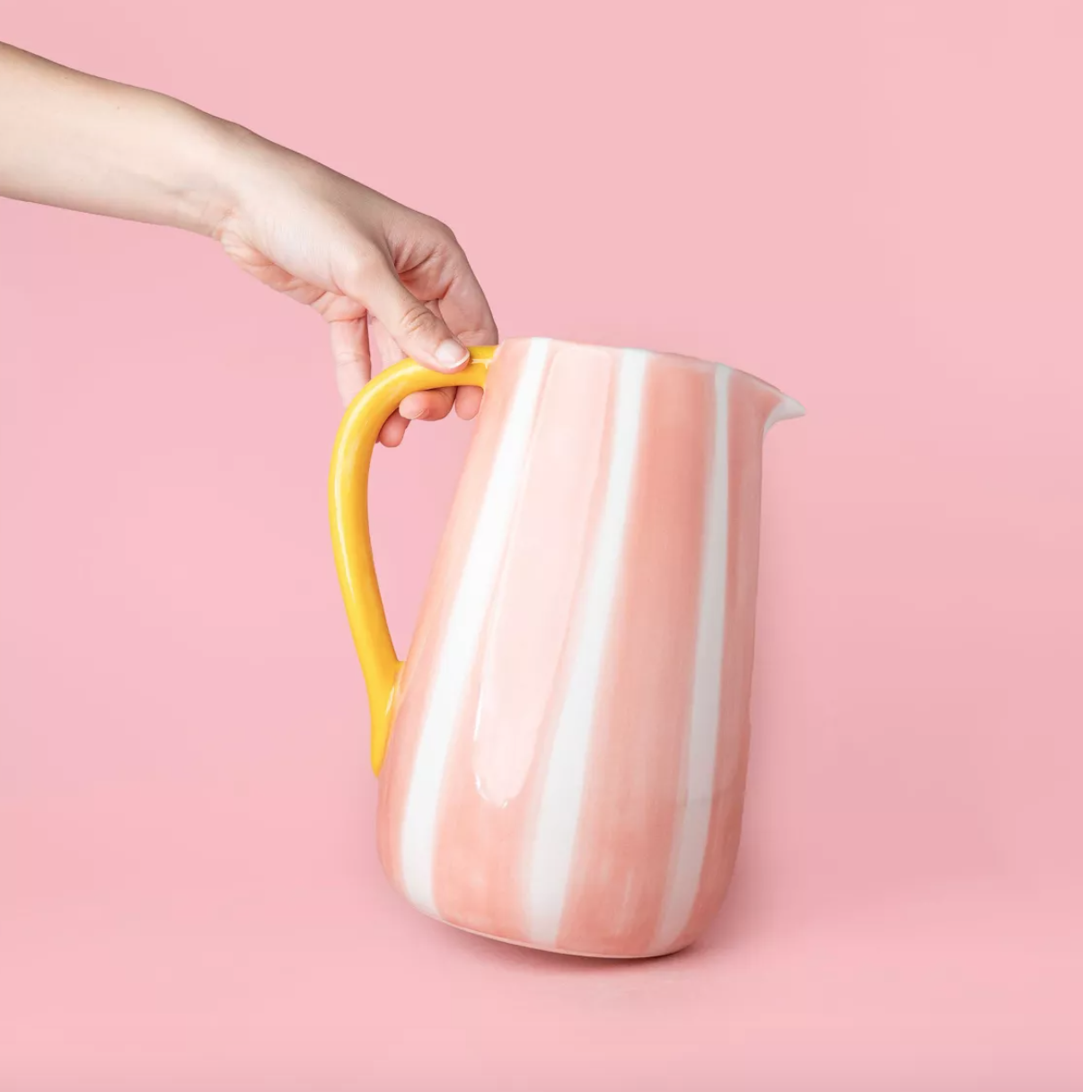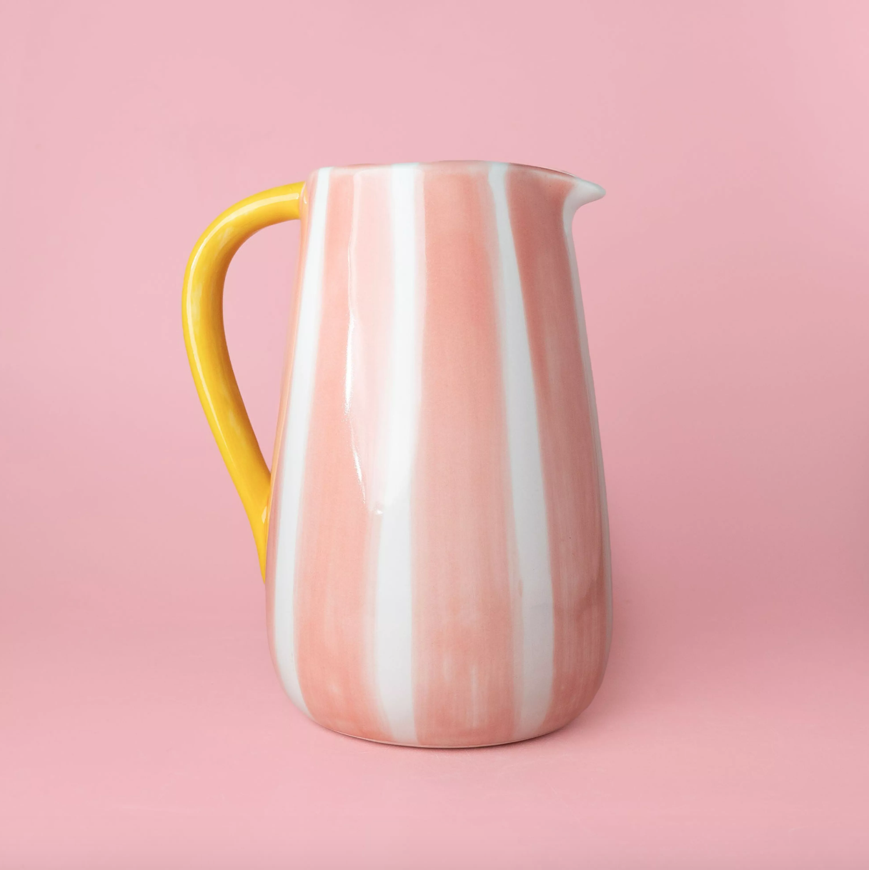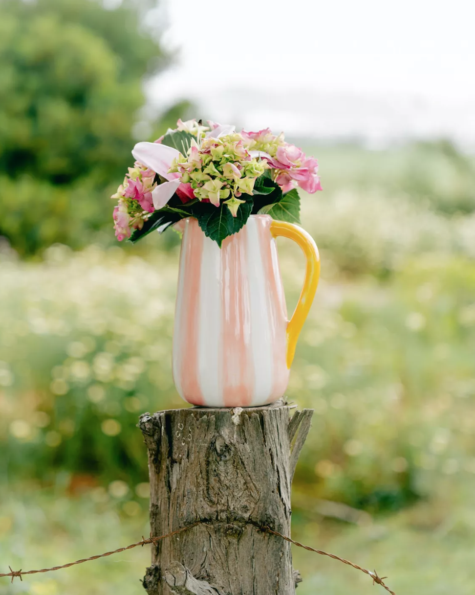 Comment ne pas craquer devant ce pichet à rayures aux couleurs toutes douces, jaune soleil et rose pastel ?