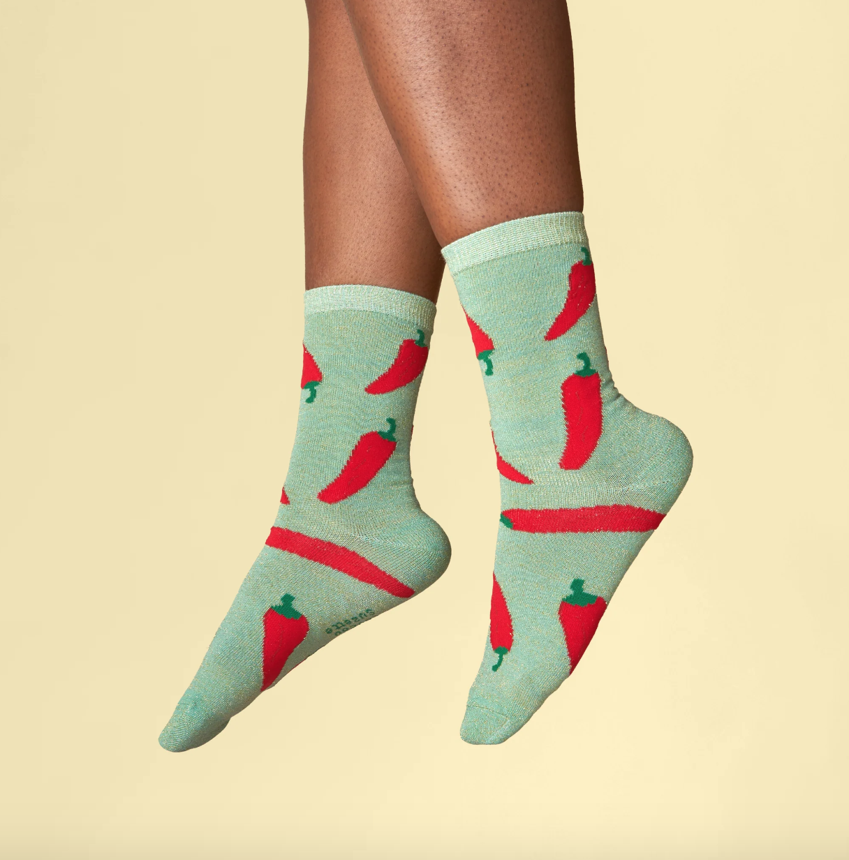 Des chaussettes pailletées aux jolis motifs piments pour un look caliente qui ne passera pas inaperçu.