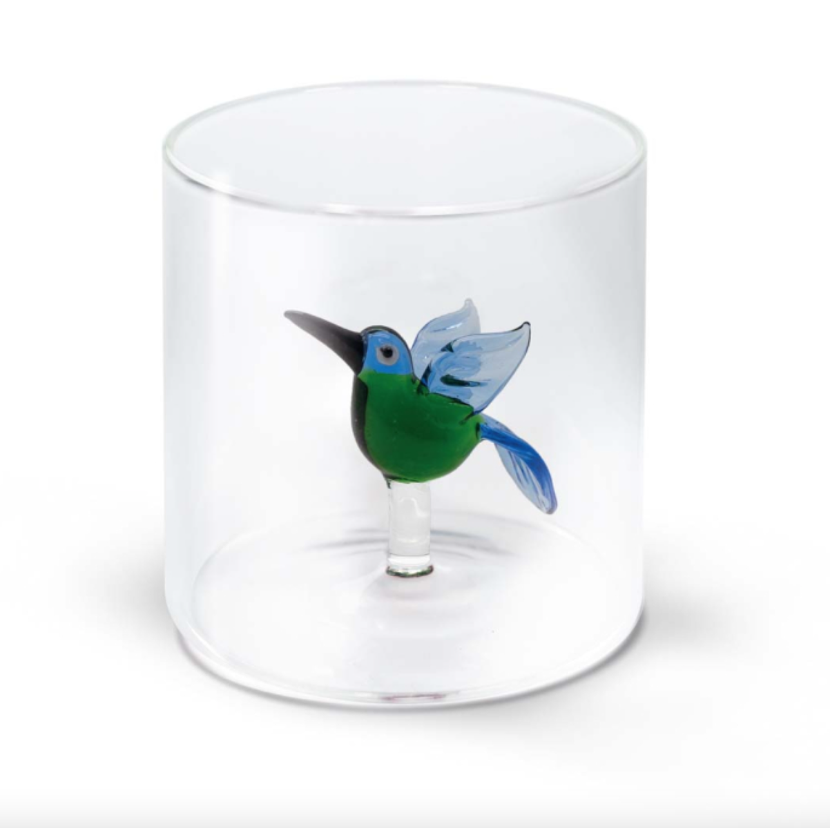 Craquez pour ce verre original qui dévoile un colibri bleu et vert. Une pièce qui apporte instantanément de la fantaisie à vos boissons, que ce soit lorsque vous recevez des invité(e)s ou pour un usage quotidien.